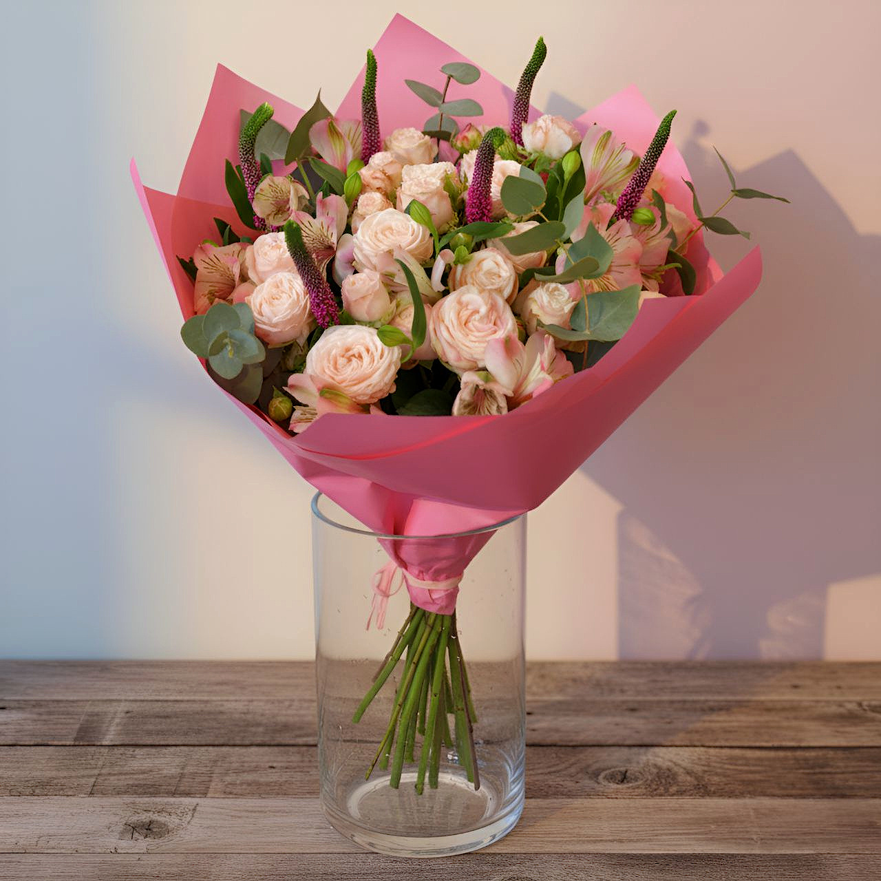 Ten pastelowy bukiet koktajlowy to uosobienie łagodności i świeżości. Delikatne róże gałązkowe w odcieniu kremowo-brzoskwiniowym, otulone liśćmi eukaliptusa i uzupełnione kwiatami alstromerii oraz smukłymi, lawendowymi kłosami veroniki, tworzą kompozycję pełną harmonii i wdzięku. Intensywnie różowa kryza stanowi wyrazisty kontrapunkt dla subtelnych barw kwiatów, podkreślając ich naturalne piękno. Bukiet idealny na wyjątkowe, a zarazem ciepłe okazje: urodziny, narodziny dziecka, Dzień Kobiet, Dzień Matki lub jako delikatny gest „bez okazji”.