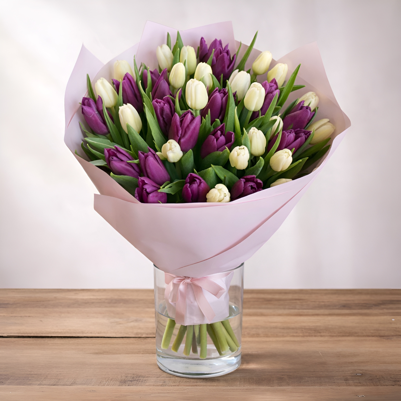 Bukiet tulipanów „Między dniem a nocą” to kompozycja oparta na subtelnym kontraście kolorów – kremowe tulipany symbolizują światło i świeżość dnia, a głęboki śliwkowy fiolet wprowadza nutę wieczornej elegancji i spokoju.