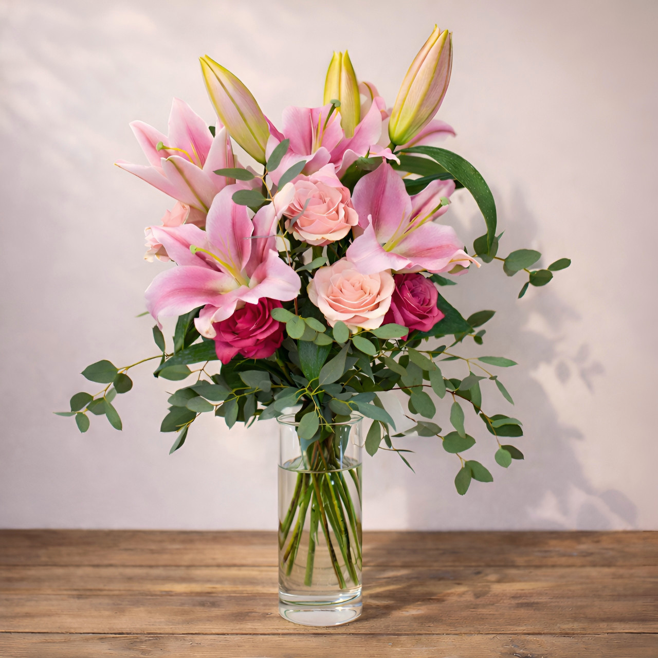 Bukiet z Różowych Lilii i Róż to jasna, elegancka kompozycja stworzona z myślą o osobach, które cenią naturalne piękno i subtelne kolory. Delikatne różowe lilie nadają bukietowi lekkości, a klasyczne róże w odcieniach pudru i głębokiego różu dodają mu szlachetnego charakteru. Całość uzupełnia świeży eukaliptus, który wprowadza nowoczesny, lekko swobodny akcent.