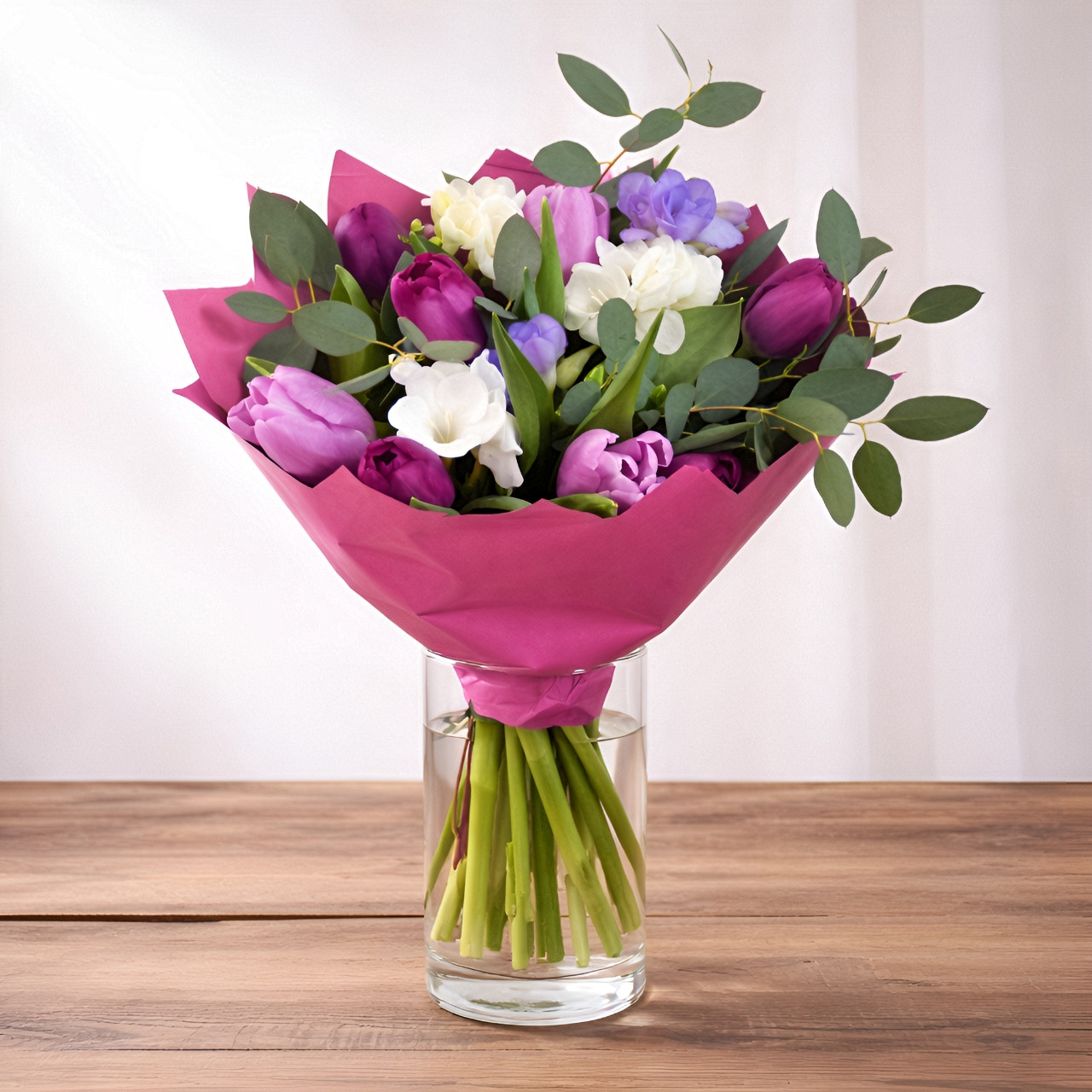 Kolorystyka oparta na fiolecie, różu i bieli nadaje kompozycji elegancji, a naturalny eukaliptus wprowadza lekkość i swobodę. To bukiet, który nie dominuje przestrzeni — on ją dopełnia. Sprawdzi się zarówno jako prezent na urodziny, podziękowanie, jak i gest „bez okazji”.