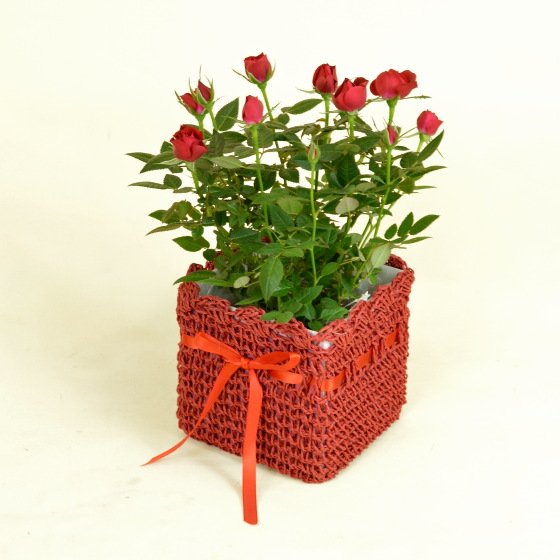 Czerwona róża doniczkowa w czerwonej osłonce, przyozdobiona wstążką. Osłonka jest przykładowa i może być zastąpiona inną, podobną.