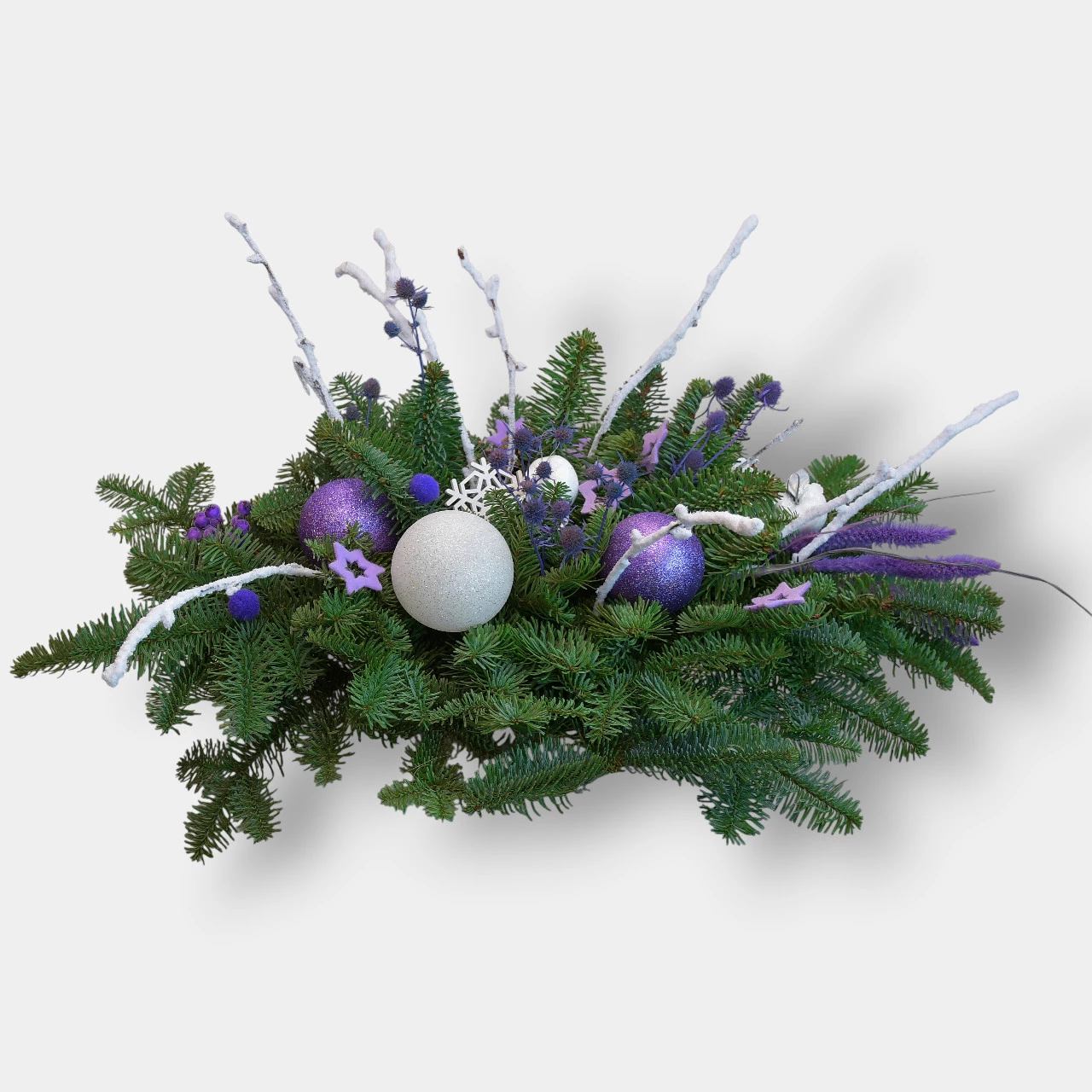 Głęboka zieleń jodły została połączona z fioletowymi i srebrzystymi dekoracjami, które nadają stroikowi nowoczesnego, lekko magicznego charakteru. Ozdobne bombki, delikatne detale oraz jasne, kontrastowe gałązki tworzą dynamiczną, ale spójną kompozycję o wyraźnym, zimowym klimacie.