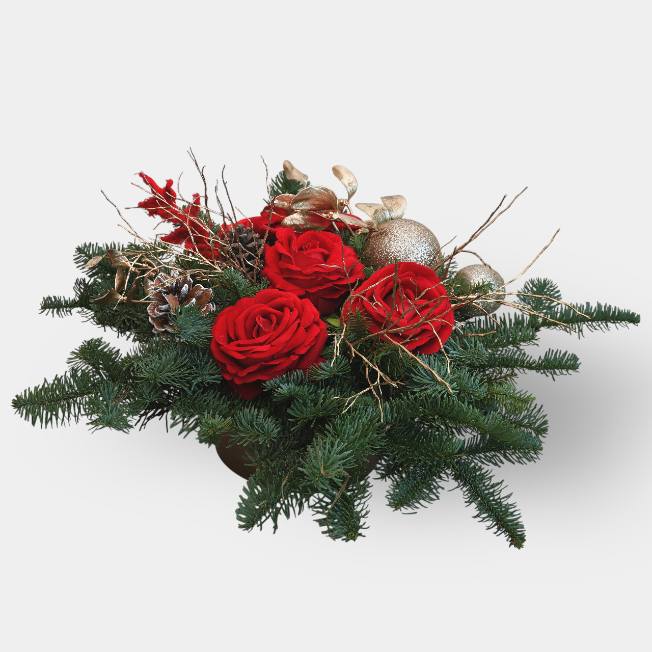 Elegancki stroik świąteczny z czerwonymi różami, wykonany na bazie naturalnej jodły, to dekoracja o wyrazistym, klasycznym charakterze. Intensywna czerwień sztucznych róż pięknie kontrastuje z głęboką zielenią jodłowych gałązek, tworząc kompozycję pełną świątecznego ciepła i elegancji.