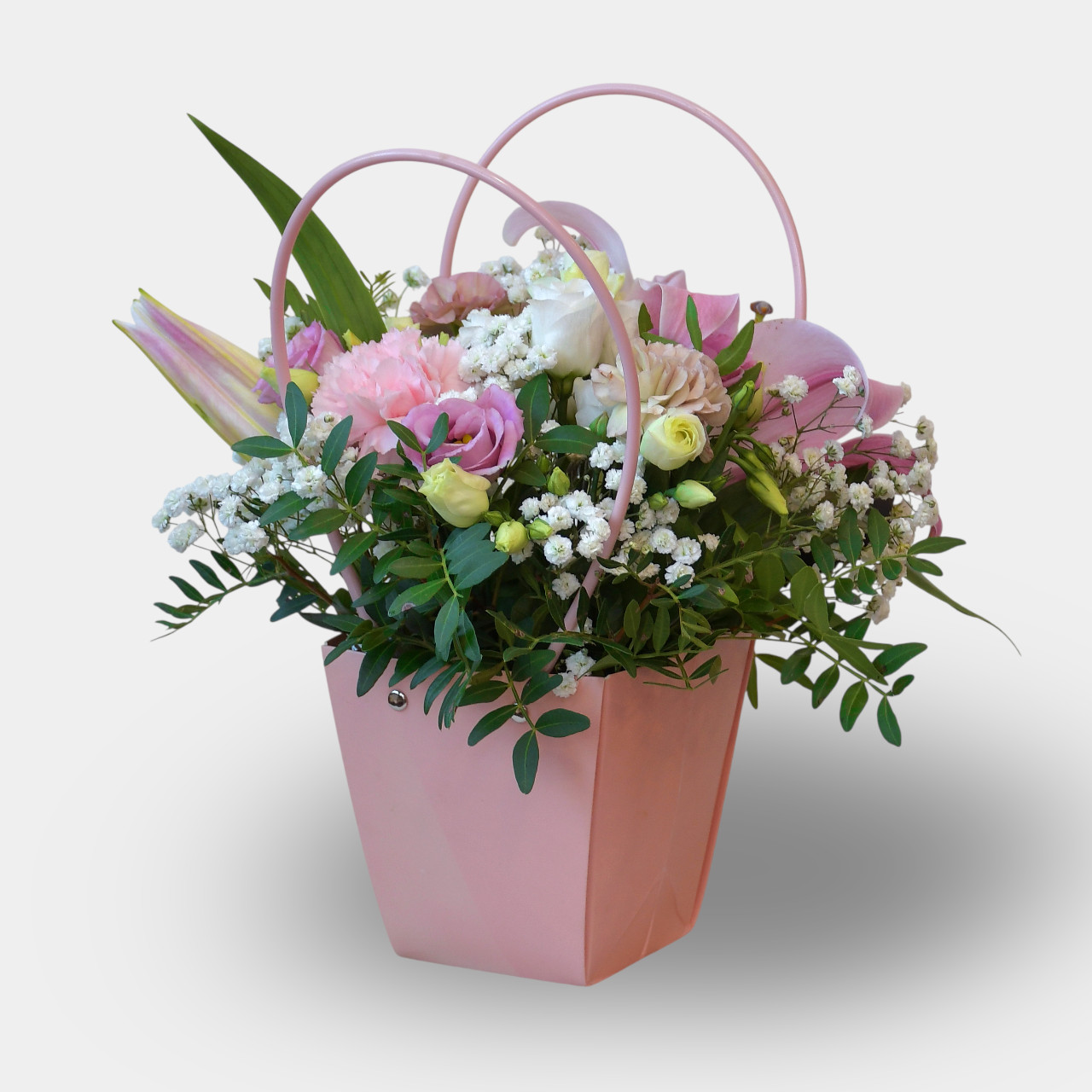 Flower box pastelowy w różowym pudełku to niewielka, ale niezwykle urokliwa kompozycja kwiatowa, stworzona z myślą o drobnych, ale znaczących gestach. Subtelne pastelowe kwiaty zostały umieszczone w oryginalnym, różowym pudełku z uchwytem, dzięki czemu całość prezentuje się nowocześnie, lekko i bardzo elegancko.