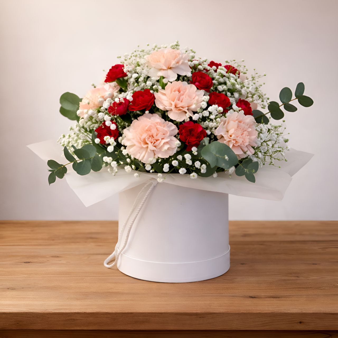 W białym, okrągłym pudełku ukryliśmy dla Ciebie delikatność różowych goździków, które spotykają się z intensywnością czerwonych. Całość otulona gipsówką i świeżymi liśćmi eukaliptusa – to połączenie subtelności i wyrazistości, które mówi więcej niż słowa.