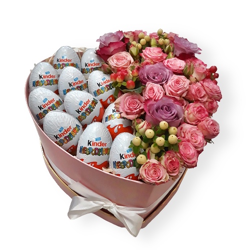 Wyjątkowy flower box w kształcie serca pełen pięknych różowych róż z dodatkami florystycznymi oraz Kinder Niespodzianek to tajemnicze pudełko pełne naturalnego piękna oraz odrobiny tajemnicy – “co jest w jajkach niespodziankach???” Niebanalny prezent dla dużych i małych na wszystkie rodzinne okazje.