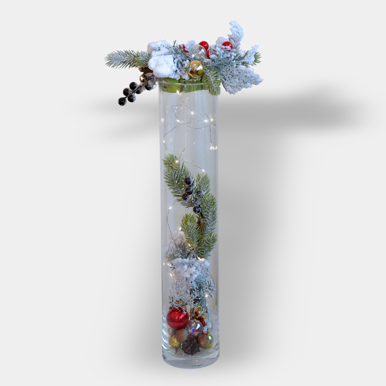 W przezroczystym wazonie umieszczono świąteczne elementy dekoracyjne, naturalne gałązki oraz subtelne oświetlenie, które delikatnie rozświetla całość i buduje zimowy, nastrojowy klimat. Górna część kompozycji została ozdobiona dekoracyjnymi gałązkami i bombkami, tworząc eleganckie, wertykalne zakończenie.