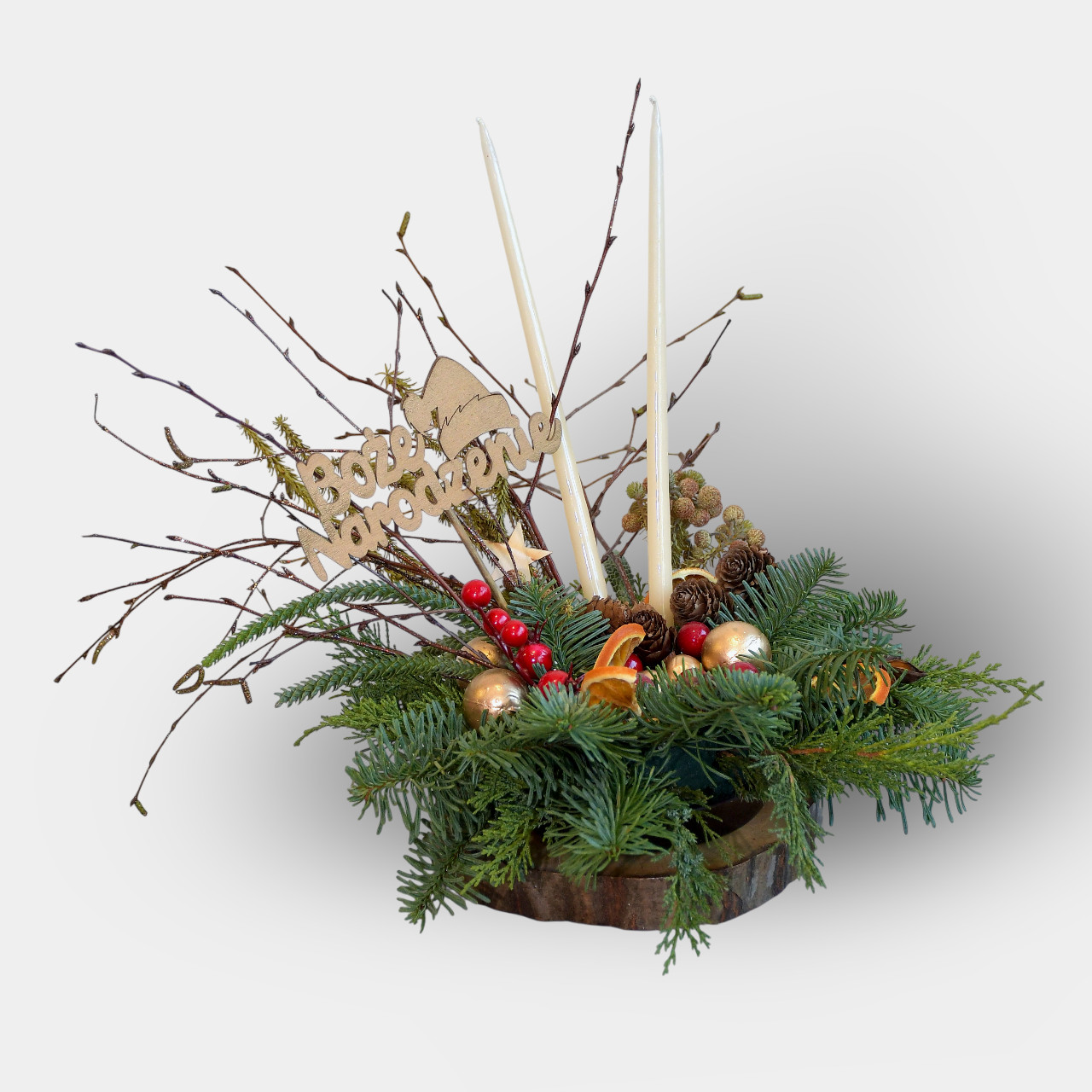 Centralnym elementem stroika są dwie smukłe świece, a całość dopełnia dekoracyjny drewniany napis „Boże Narodzenie”, który nadaje aranżacji jednoznacznie świąteczny charakter. Naturalne gałązki jodły zostały uzupełnione świątecznymi dodatkami w ciepłych, klasycznych barwach, tworząc harmonijną i ponadczasową całość.